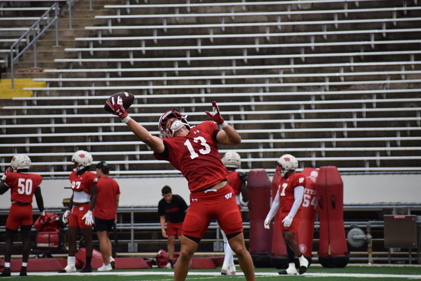 Wisconsin Badgers safety Matthew Traynor (13) hauls in a one-handed catch in individual drills at practice.