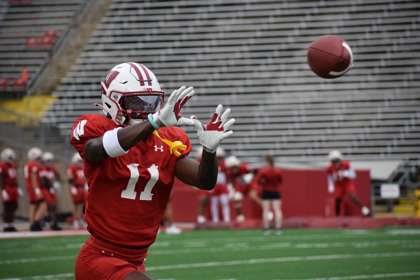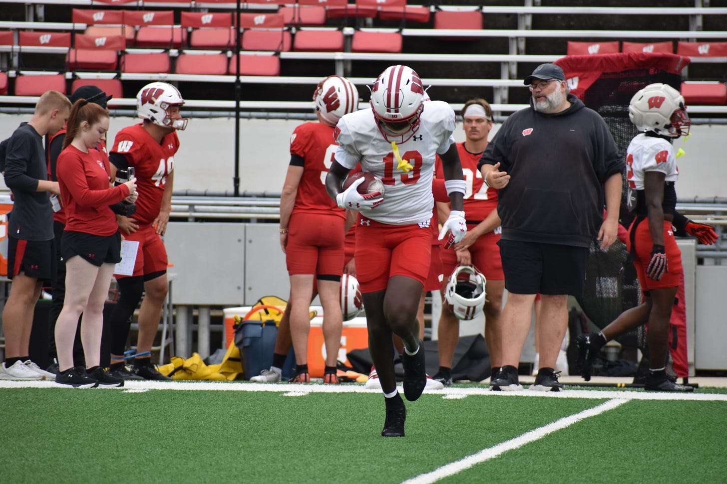 Wisconsin Badgers freshman receiver Eugene Hilton Jr. (13) catches a pass in practice.