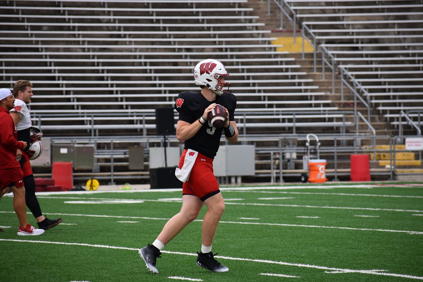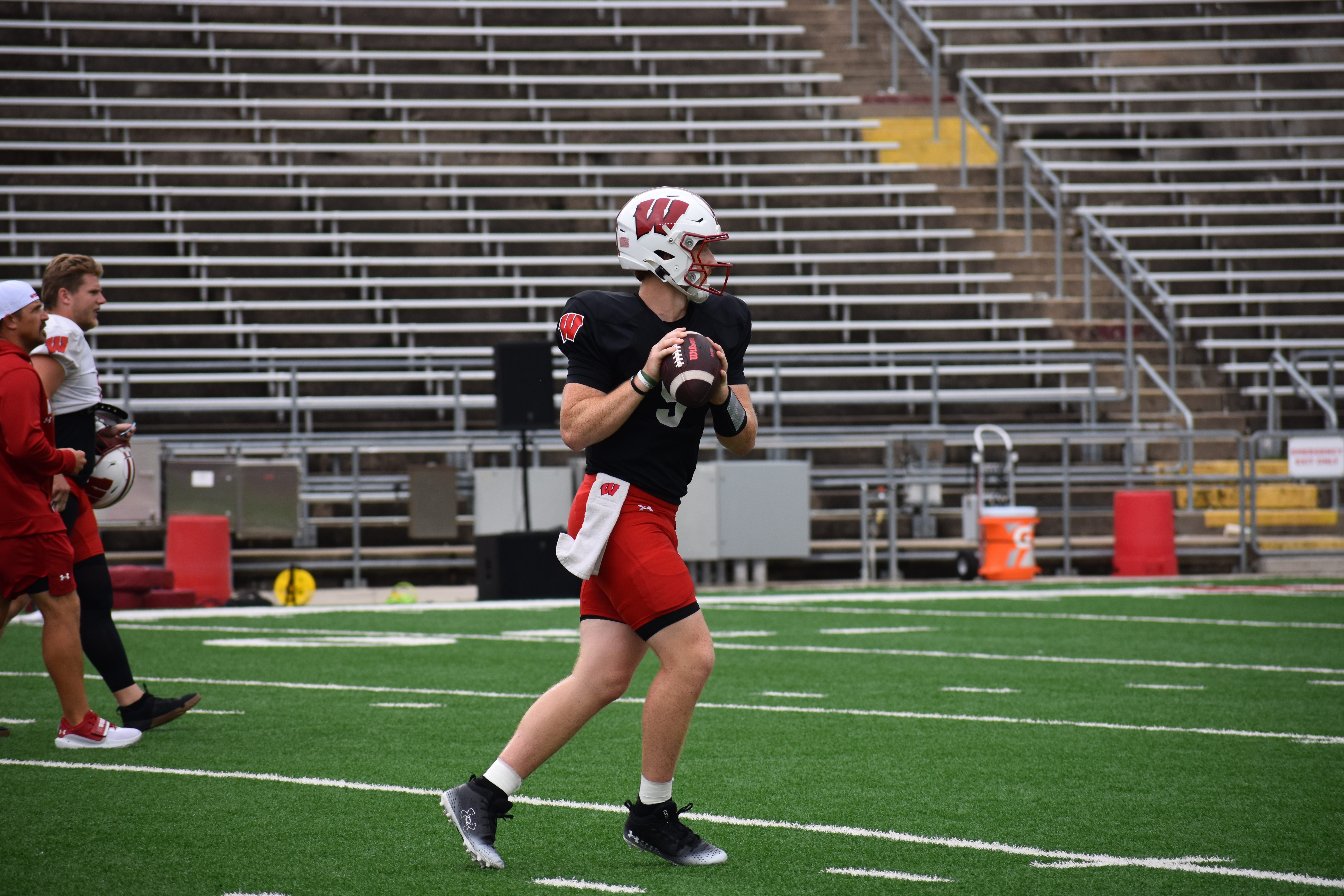 Wisconsin Badgers QB Billy Edwards Jr. (9) warms up at the start of practice.