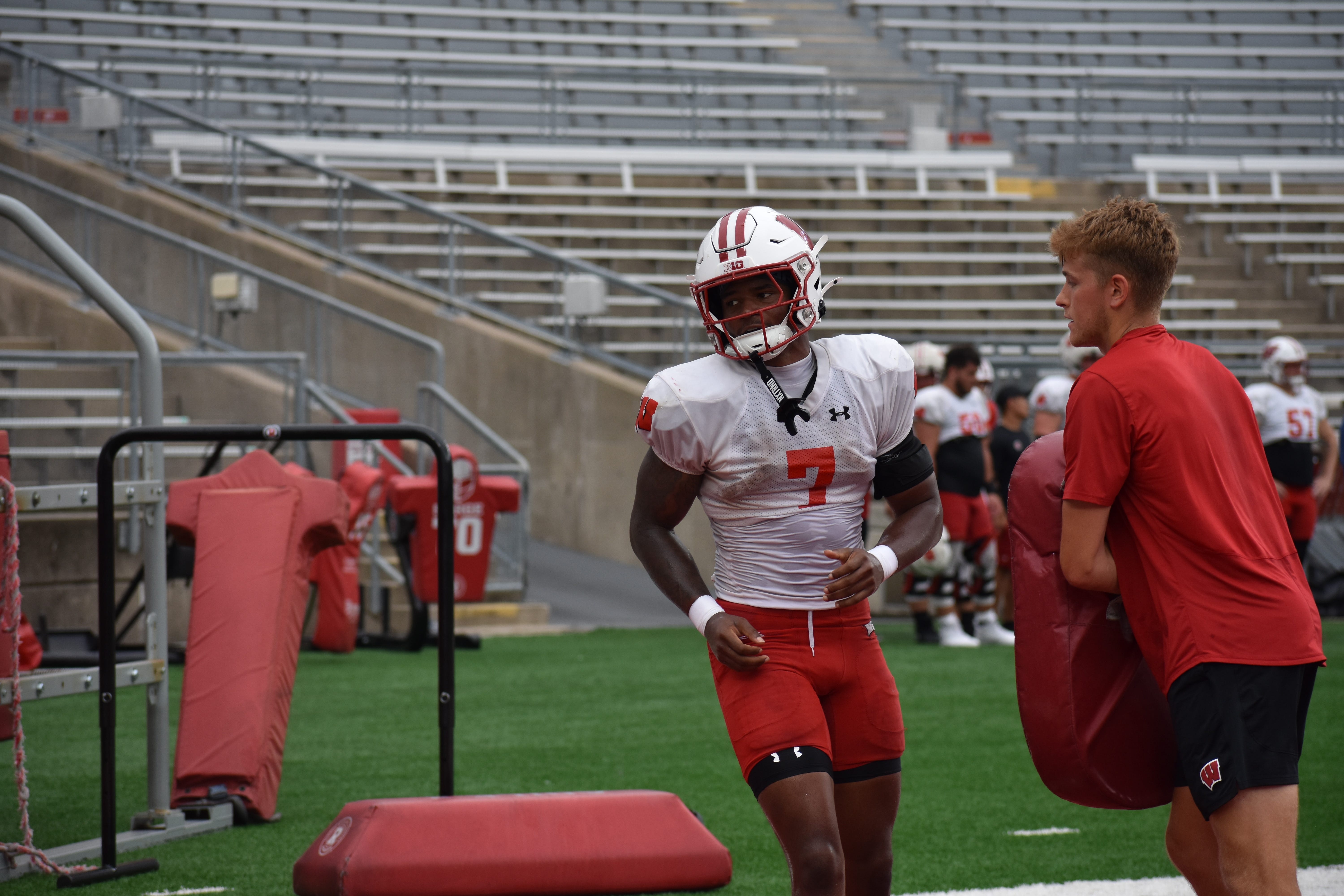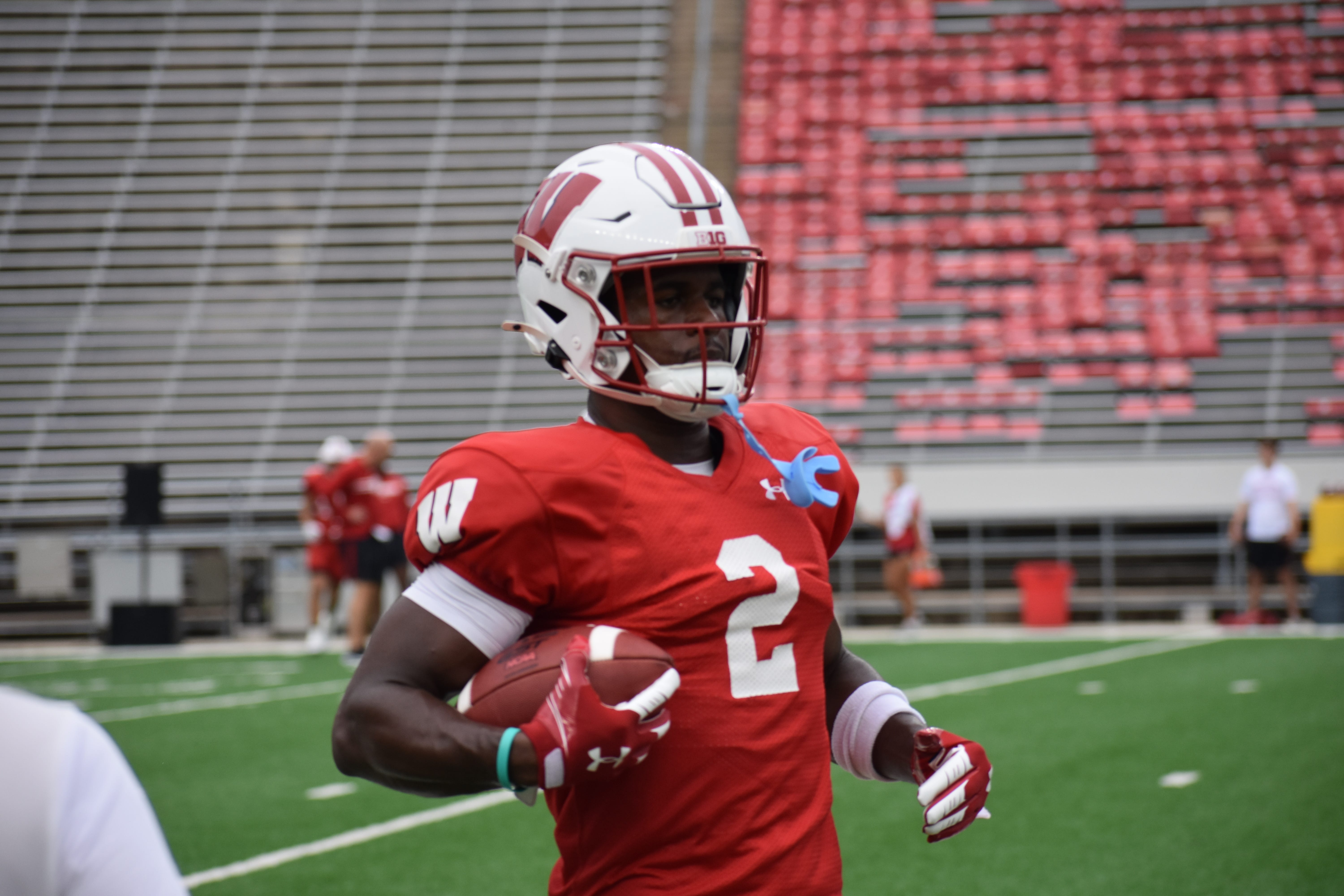 Wisconsin Badgers running back Dilin Jones (7) participates in individual drills at practice.