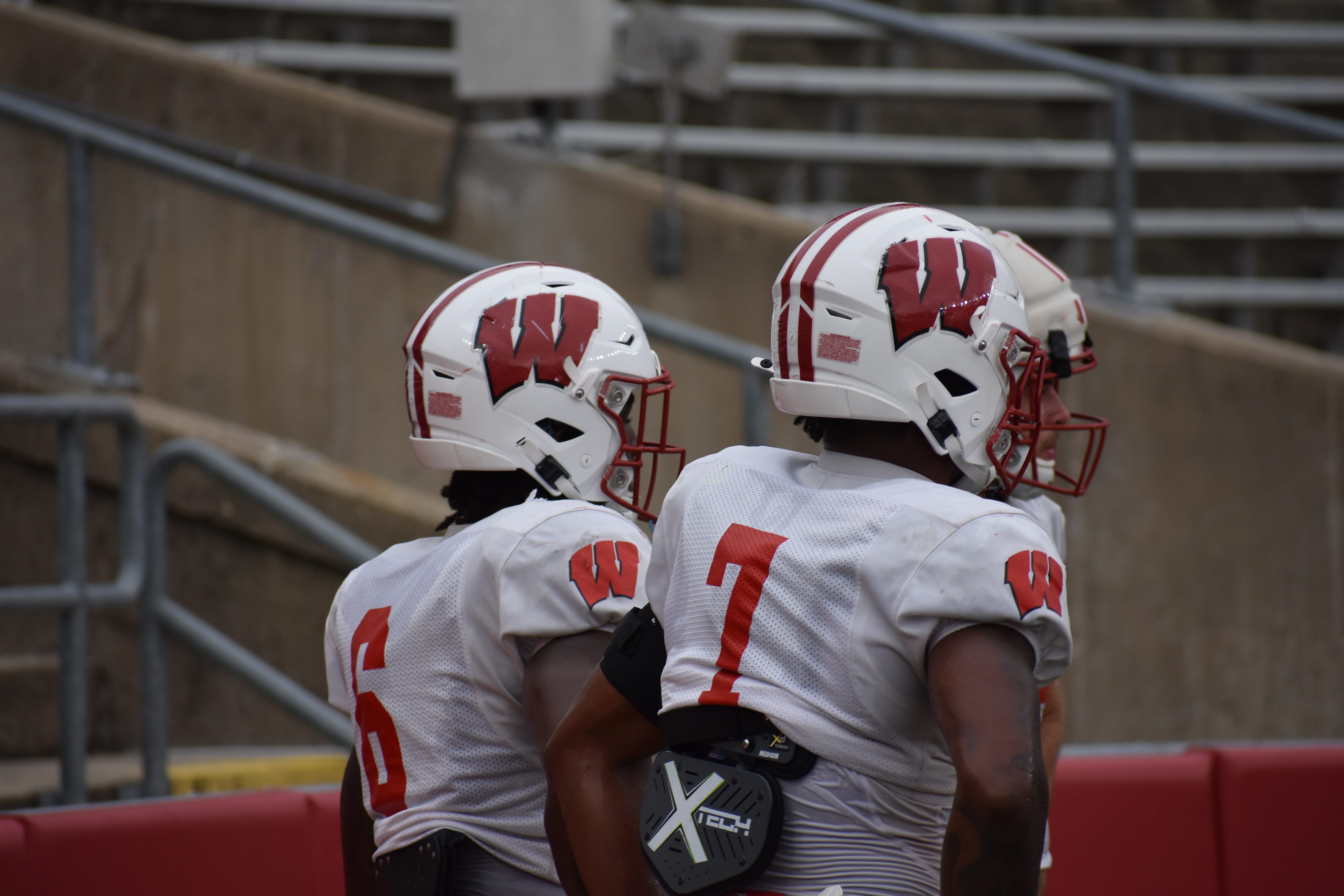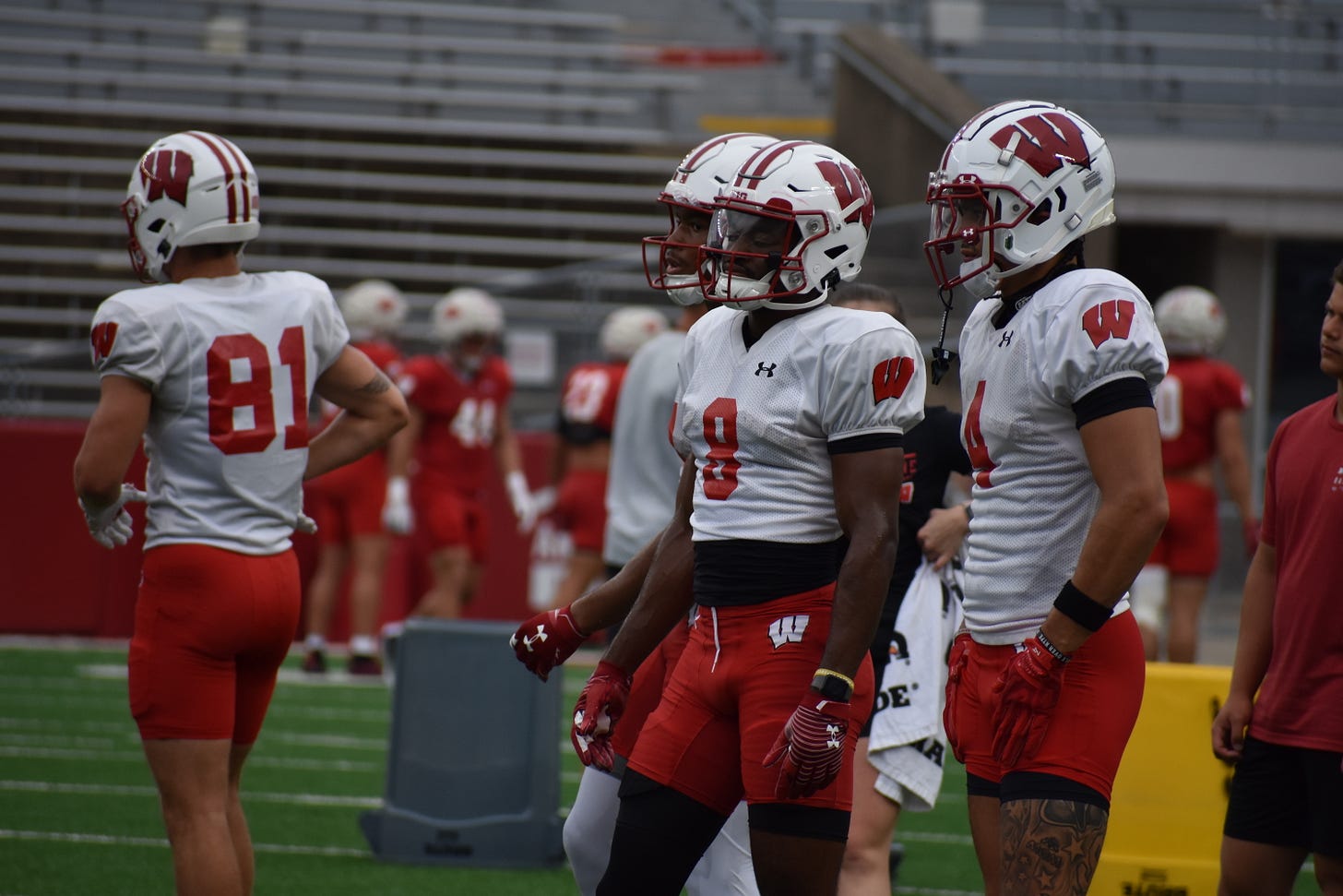Wisconsin Badgers wide receivers Vinny Anthony (8) and Jayden Ballard (4) take part in routes at practice.