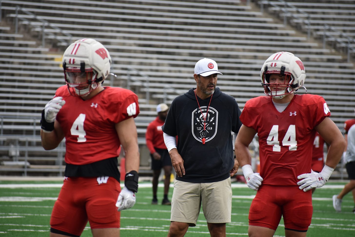 Wisconsin Badgers inside linebackers Tackett Curtis (4) and Cooper Catalano (44) participate in individual drills in front of head coach Luke Fickell at practice.