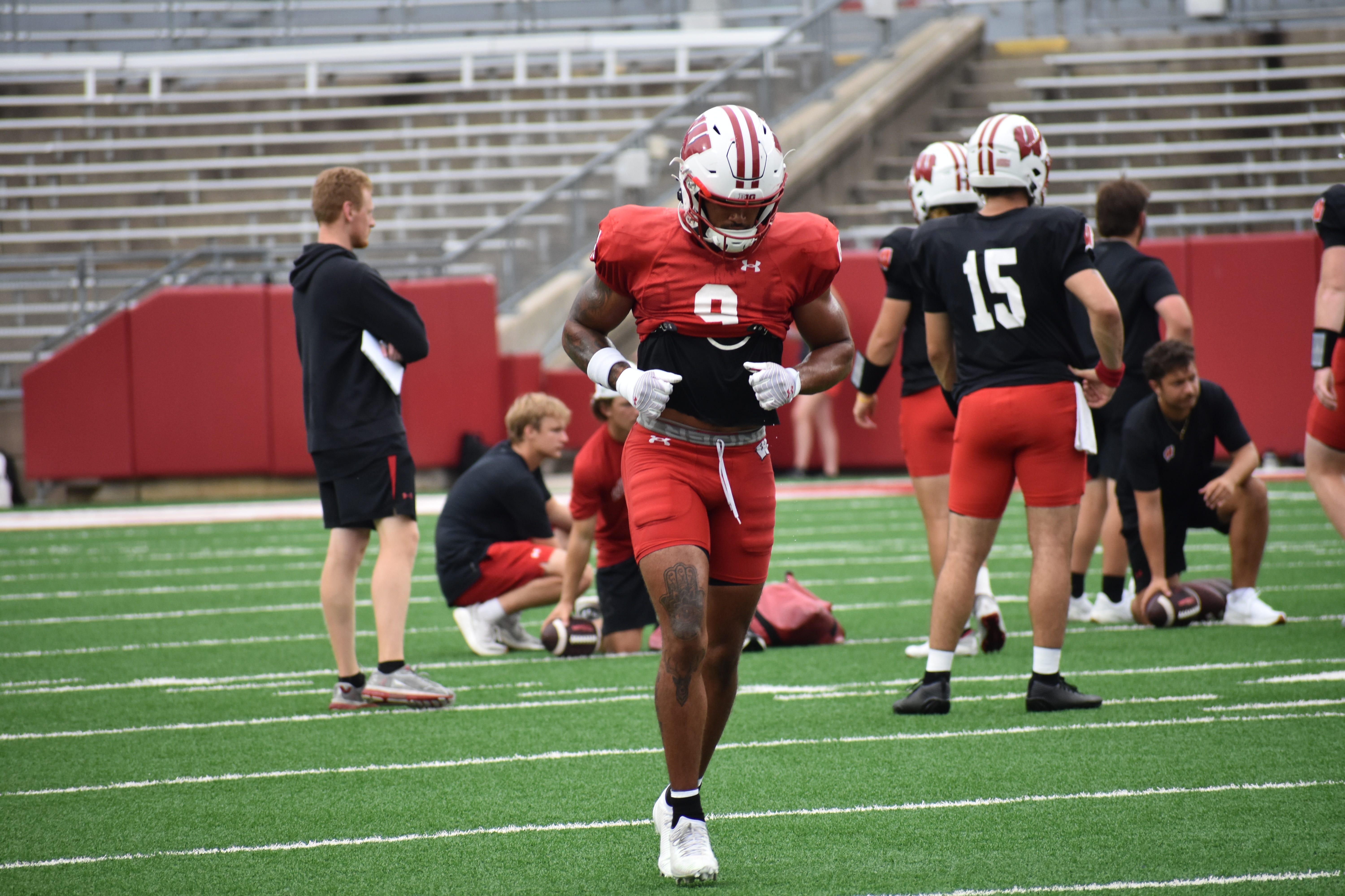 Wisconsin Badgers safety Austin Brown (9) participates in individual drills at practice.