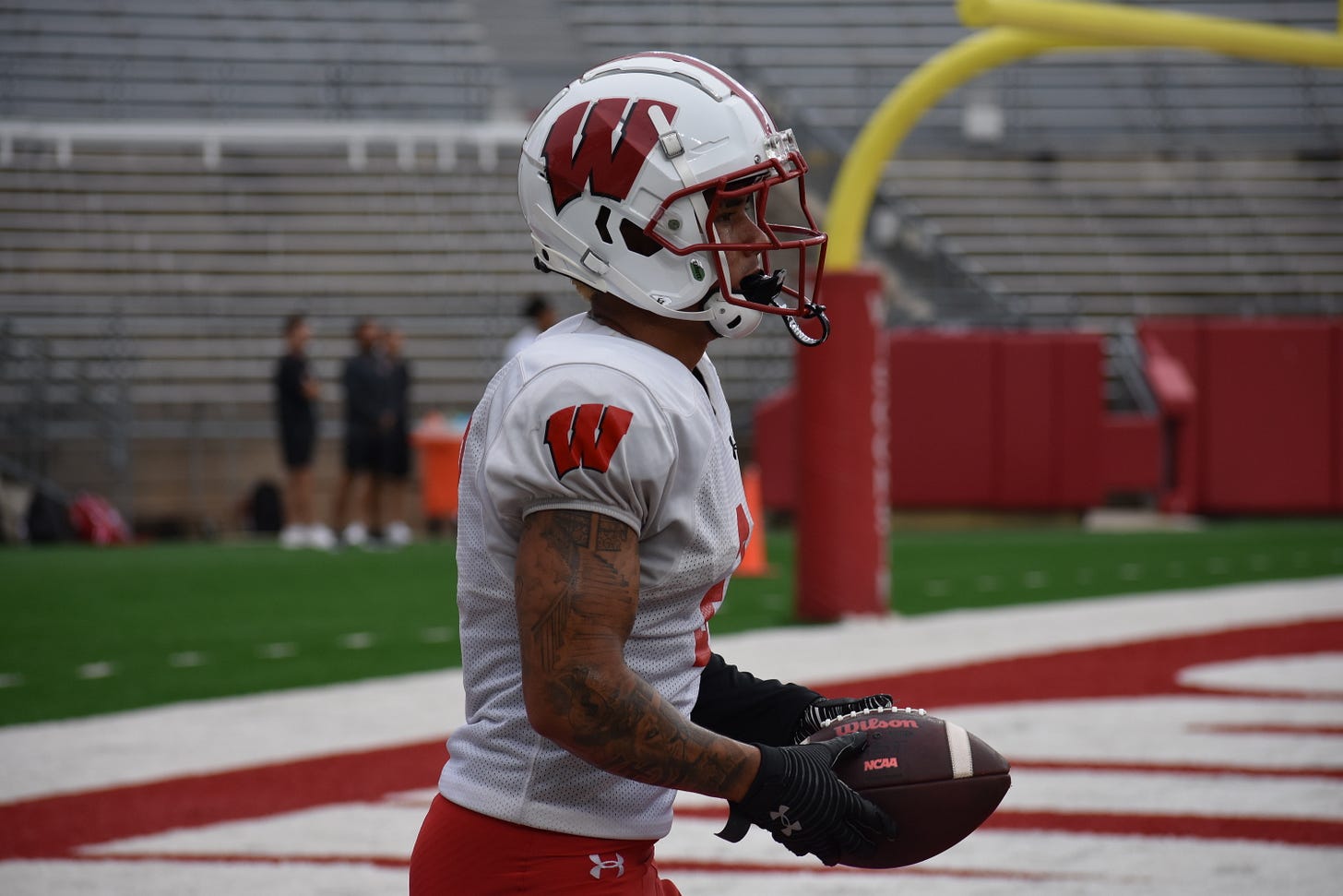 Wisconsin Badgers receive Trech Kekahuna (2) heads back to the drill after catching a deep pass in practice.