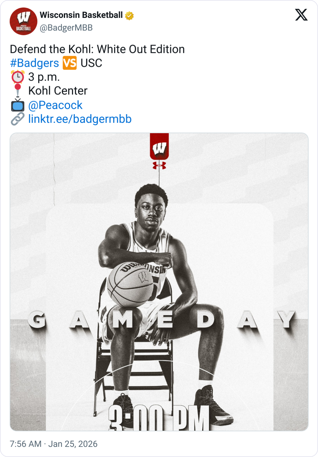 The Badgers are at the Kohl Center this afternoon, riding a five-game winning streak and playing their most explosive basketball of the season. Following a 96-87 win over Rutgers and a stunning 98-71 road demolition of Penn State on Thursday, the Badgers (14-5, 6-2 Big Ten) are looking to stay hot against the USC Trojans (14-5, 3-5 Big Ten).