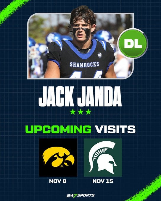 Similarly, committed right end Jack Janda has been busy lining up other visits. Right now, he has visits lined up with Iowa (Nov. 8) and Michigan State (Nov. 15) according to 247Sports reports, Allen Trieu.