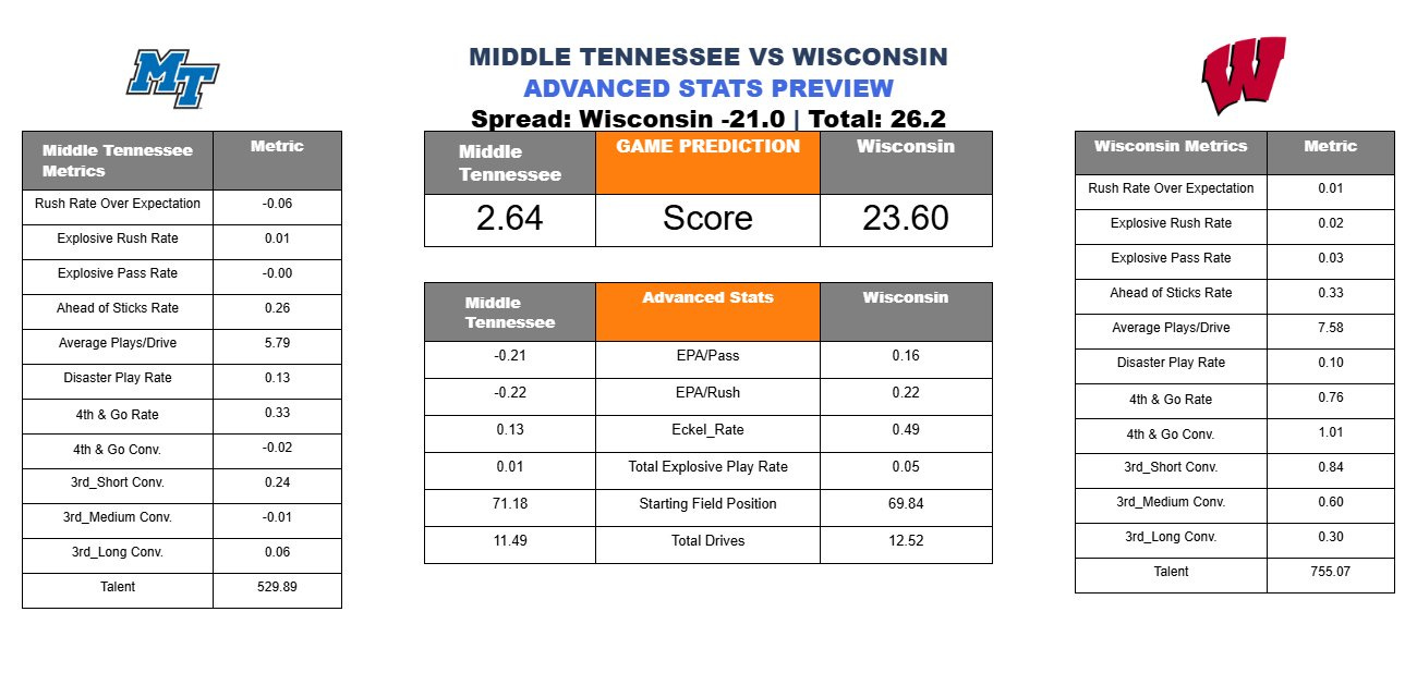 Each week, he provides some analytics and a prediction for both teams in the upcoming Wisconsin football matchup. Here is his breakdown for the Badgers’ game this week against Middle Tennessee.